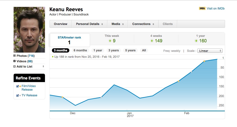 Keanu is currently #1 on the IMDb star meter. He has been in that position since February 12.