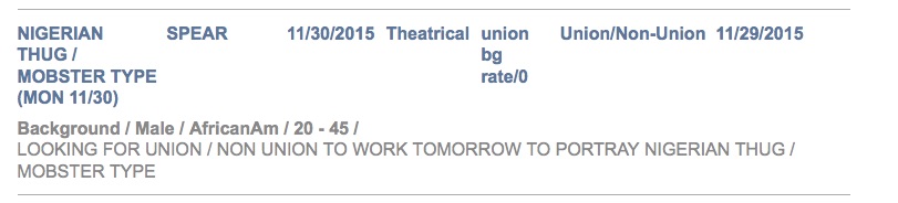 There are looking for a union/non-union African American male, age 20-45, to play a Nigerian thug for a scene on Monday, November 30. Notice is currently here.