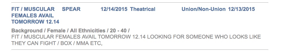 They are looking for union/non-union fit/muscular females of all ethnicities, age 20-40, who look like they can fight, box or MMA for a scene on Monday, December 14. Notice is currently here.
