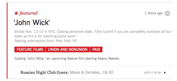 The Backstage posted a casting call for males and females to portray Russian Night Club Patrons in John Wick. The scene is slated to be shot November 12-15 and extras must be present on all four days