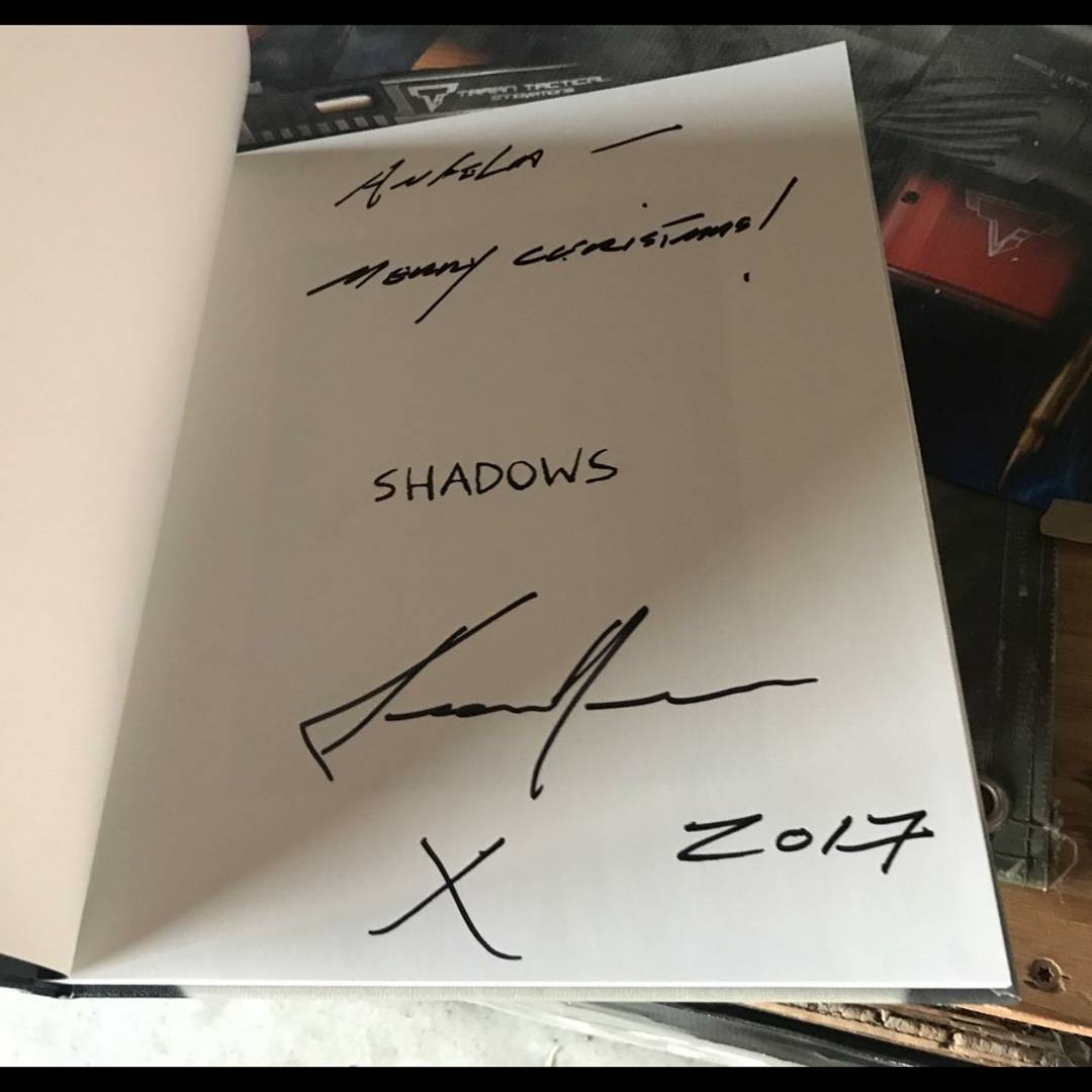 Many thanks to Taran Tactical for sharing a clip of Keanu signing a copy of Shadows for Angela Marie on instagram.