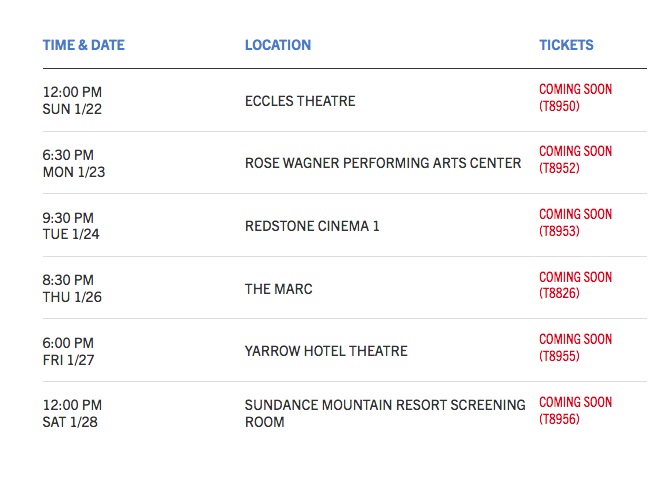 The Sundance Institute has updated the page for To the Bone. the full screening schedule is now listed. Ticket info for those in the area will be listed soon.
