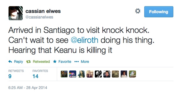 Cassian Elwes Visits Knock, Knock Set Posted on April 28, 2014 9:19 pm by Many thanks to @cassianelwes who has tweeted that he has arrived in Santiago to visit the Knock, Knock set. He reports that he hears that Keanu is killing it.