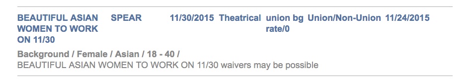 Casting Network has acalls out for union/non-union beautiful Asian women, ages 18 – 40 for a scene that will shoot on Monday, November 30. The notice is currently here.