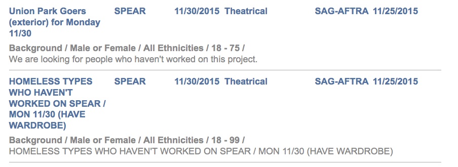 They are looking for SAG-AFTRA males/females of all ethnicities, age 18-99 who haven’t worked on the film before to play homeless types. Notice is currently here.