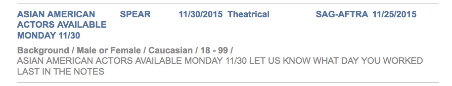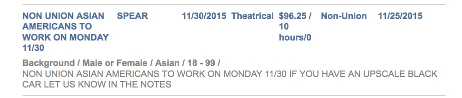 They are looking for non-union Asian males/females. age 18-99, with upscale cars for a scene. Notice is currently here.