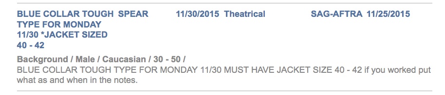 They are looking for SAG-AFTRA Caucasian male, age 30-50 and jacket size 40-42, to play a bule collar tough guy for scene. Notice is currently here.
