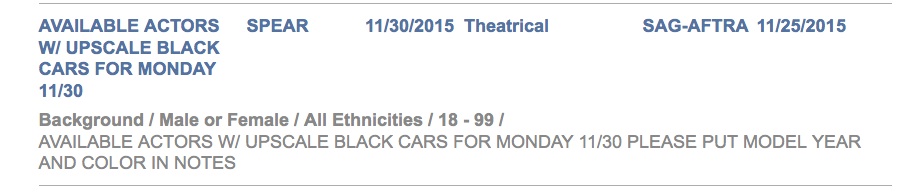They are looking for males/females of all ethnicities, age 18-99 with upscale black cars to be in the background of a scene . Notice is currently here.