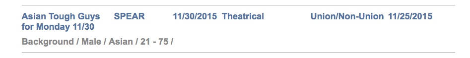 They are looking for Asian males,age 21-75, to play Asian tough guys for a scene. Notice is currently here.