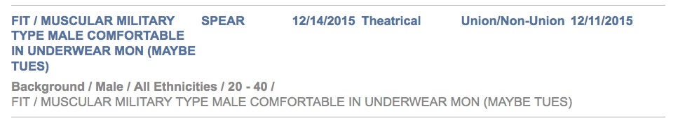 They are looking for a union/non-union male of all ethnicities, age 20-40, who is a fit muscular military type that is comfortable in underwear to film a scene on Monday, December 14. The notice is currently here.