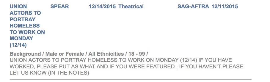 They are looking for SAG-AFTRA males/females of all ethnicities, ages 18-99, to portray homeless folks in a scene to be filmed on Monday, December 14. The notice is currently here.