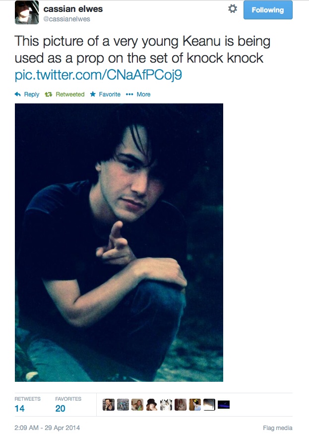 Many thanks to @cassianelwes who has tweeted that a one of Deborah Feingold’s photos of a young Keanu Reeves is being used as a prop for Knock, Knock.