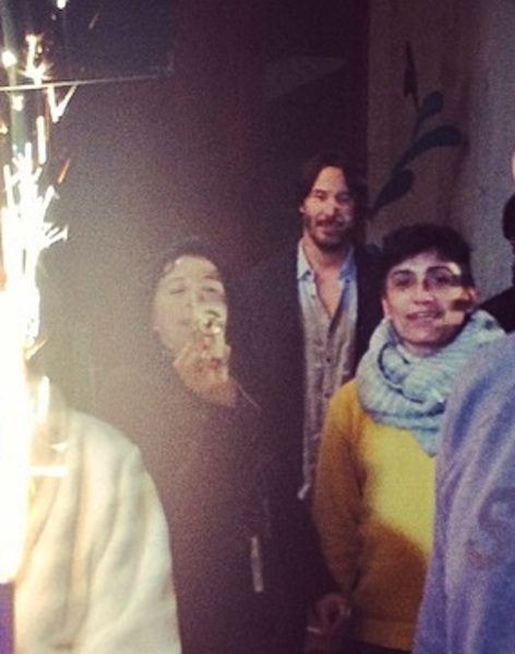 Many thanks to Nicolas Lopez for sharing a photo of Eli Roth’s birthday celebration on the set of Knock, Knock. Keanu can be seen in the background. The photo is here. A cropped version is below.