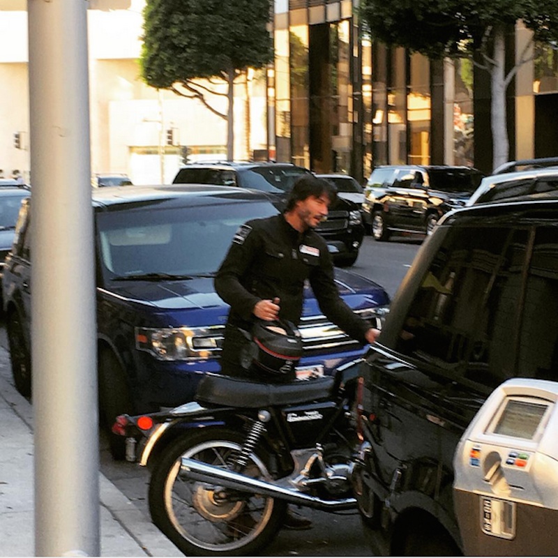 Update X2: Many thanks to artsbabe who shared a photo of Keanu on instagram and to Angel for the heads up on the link! She snapped the photo as Keanu was near his parked bike out on the street.