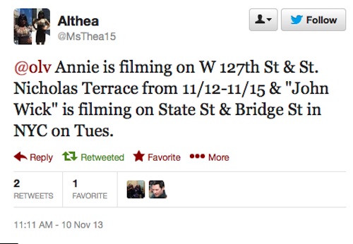 Update: On Vacation Location has posted that it is rumored that John Wick is shooting around times Square in their main list for Tuesday. The calendar in their side bar indicates that the info is coming from a sign that has been posted in the Times Square area that is saying to move cars and lists John WIck. It is not clear if they will be shooting at State & Bridge, Time Square or both locations. On Oct. 31 and several other days in Oct. JW shot at two different locations on the same day. If folks start tweeting sightings of JW filming tomorrow, I’ll update.