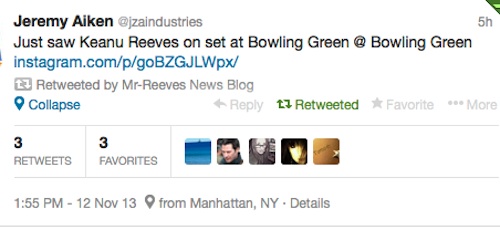 Keanu Reeves stopped to take a photo with fans during filming on John Wick at Bowling Green. According to google Bowling Green is New York City’s oldest park.