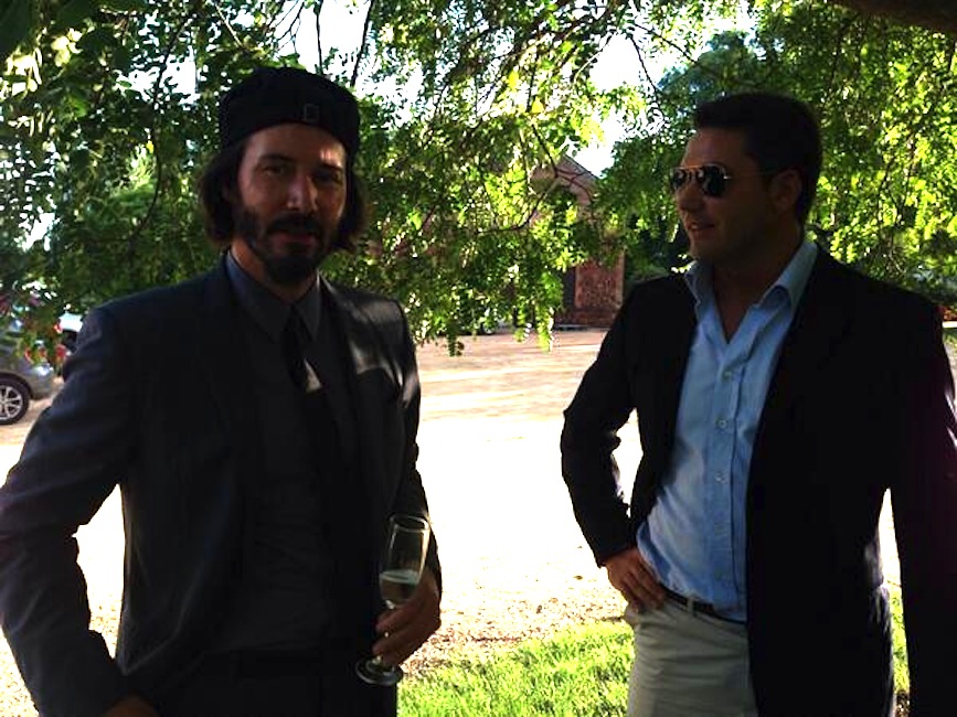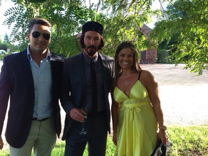 A guest has tweeted a photo of Keanu Reeves that was taken at the wedding today. The photo is dark but if you look closely he appears to be wearing a suit along with his favorite cap on backwards.