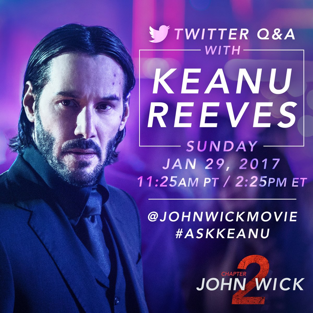 Keanu Twitter Q&A Posted on January 27, 2017 3:51 pm by @JohnWickMovie has tweeted that Keanu will be doing a twitter Q&A on Sunday, January 29 at 11:25am PT/2:25pm ET.