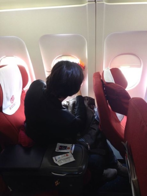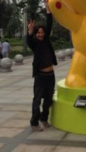 Keanu and cohorts are catching a flight this morning (June 26) to Guangzhou. Tiger has posted a photo of Keanu flashing a peace sign near a statue before they left for the airport. The note says that he is saying goodbye to Nanjing. There is a photo of Keanu at the airport (his back is to us) with his ‘little friend’ perched on his shoulder looking out at the runway. Tiger said that it is cloudy in Nanjing this morning.