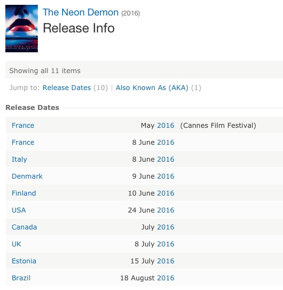 The released schedule for The Neon Demon in various countries as of today on IMDb is below. The film will open in the USA on June 24, 2016.