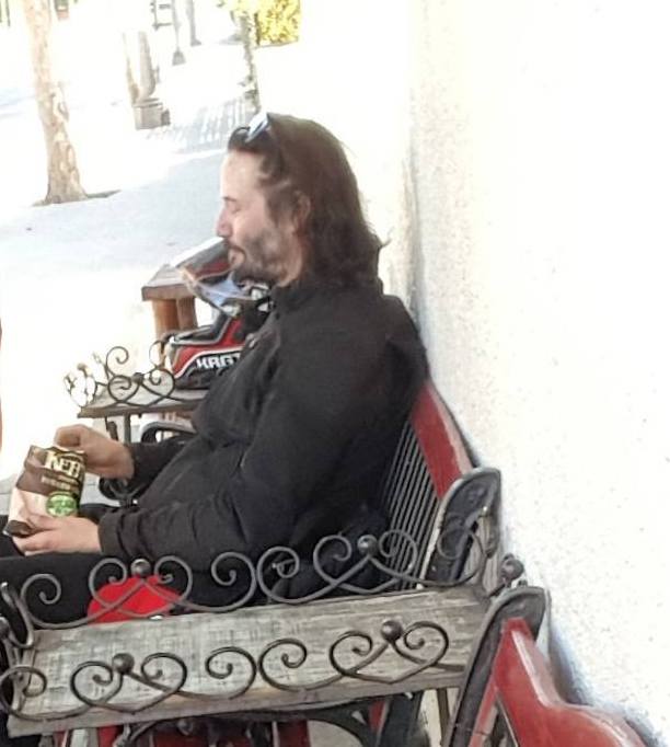 Many thanks to lamarcus_harveys_art for sharing a photo of Keanu on instagram. The photo was posted today and shows Keanu sitting on a bench eating a snack. The poster commented further downstream that Keanu was behind him in line. Cropped photo below.