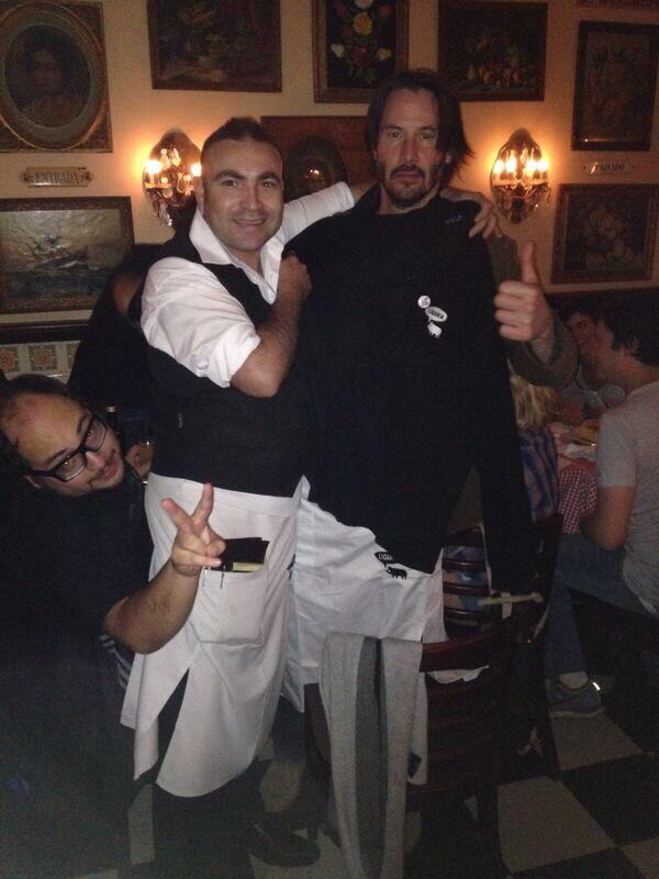 Many thanks to @bar_liguria for sharing the photo that they took with Keanu Reeves on twitter. It looks like one of the staff took a photo with Keanu. It’s not clear what Keanu is wearing. It looks like he has an apron on and the gentleman is holding some kind of tee shirt/ sweater up to him. The photo is here.