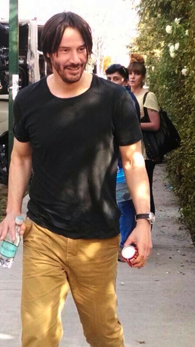Many thanks to @mperezdearce who has shared the photo that she took of Keanu Reeves. He’s in a tee shirt and carrying his standard bottle of water and a soda. The photo is here.