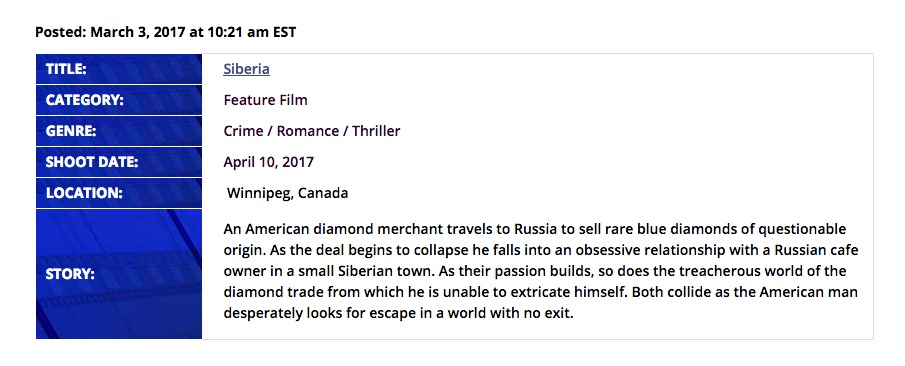 My Entertainment World has posted that the Siberia film shoot will begin on April 10 in Winnipeg. Film shoots seldom start on time for one reason or another but the production now has a projected start date.