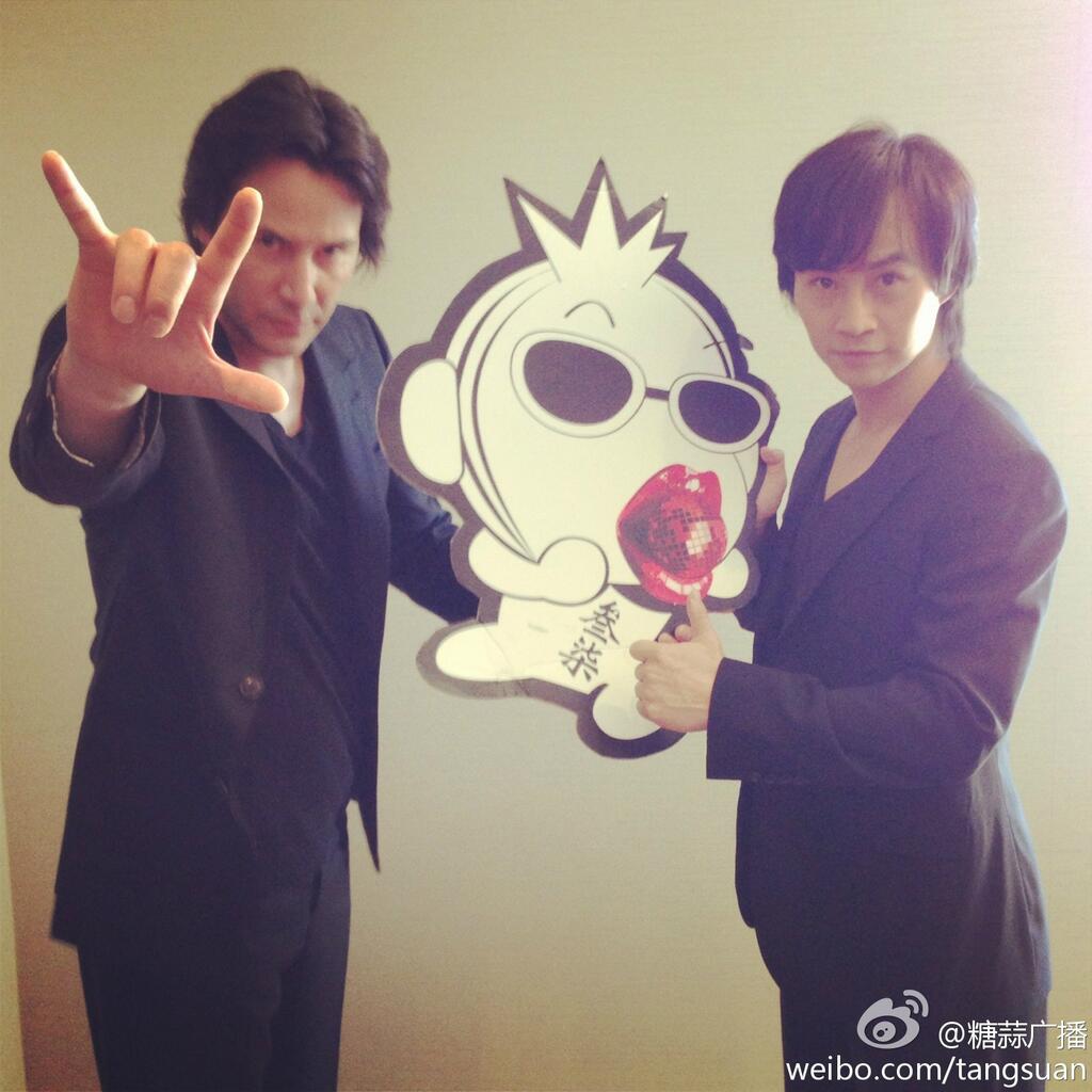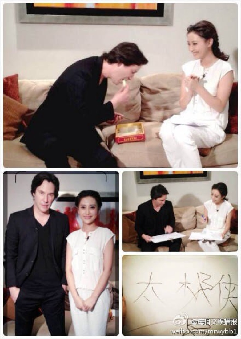 There are two new photos on Tiger’s Tencent Weibo page. The first is a group shot of Keanu, Tiger and Lemore Syvan with executives (I assume from Wanda). In the second, we see Keanu with what appears to be a host from another TV show. It appears that he wrote a message in Chinese in the lower right hand corner of the photo.