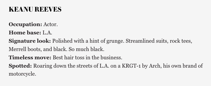 Vanity Fair published their best dressed list today. Keanu made the list. A capture of his entry is below.